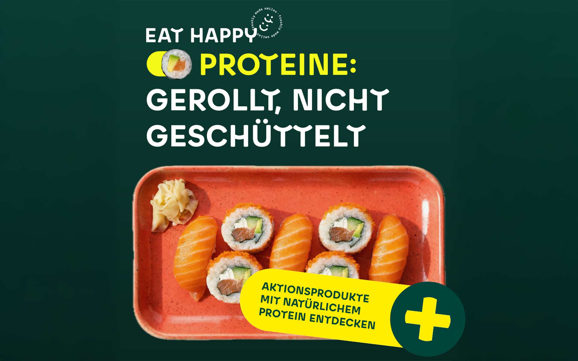 Ausgewählte Sushi-Produkte mit besonders hohem Proteinanteil sorgen für extra Power in deinem Alltag. Dank der Aktions-Sticker erkennst du die passenden Produkte direkt in unserer GenießerWelt am EAT HAPPY Shop. Und das Beste: Gewinne mit etwas Glück ein Jahresabo fürs Gym.