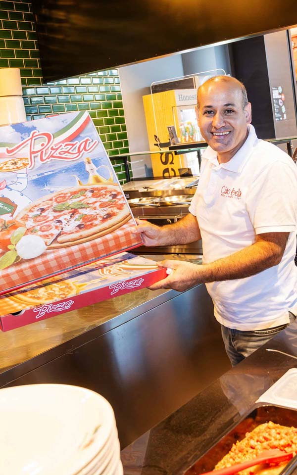 In der offenen Küche mit dem original italienischen Pizzaofen werden alle Bestellungen frisch zubereitet. Genieße Pizza, Pasta & Co. im gemütlichen Restaurant. Für alle, die es eilig haben oder nur schnell eine Kleinigkeit auf die Hand möchten, wartet eine tolle Auswahl an der „heißen Theke“. Oder suche dir aus der großen Speisekarte einfach ein Gericht zum Mitnehmen aus.