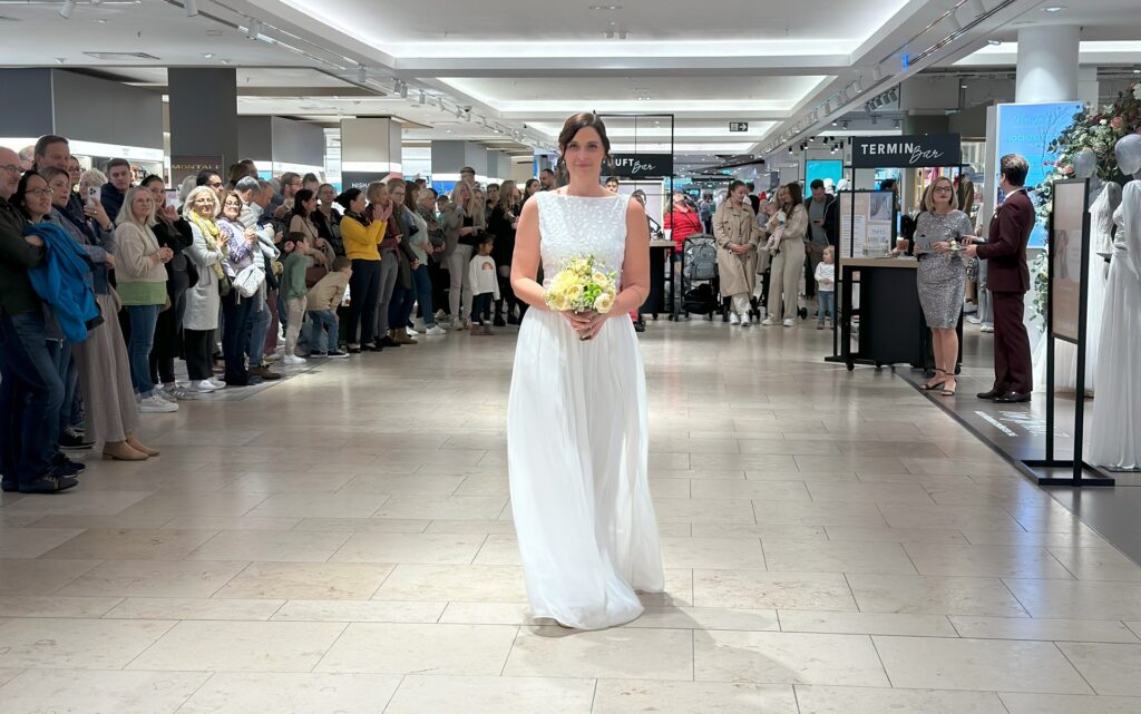 Eine Frau im Brautkleid läuft vor Publikum über die dodenhof Mall
